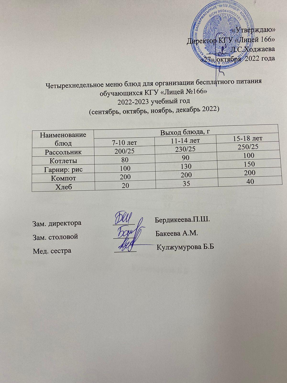 Четырехнедельное меню блюд для организации бесплатного питания обучающихся КГУ "Лицей №166" 2022-2023 учебный год